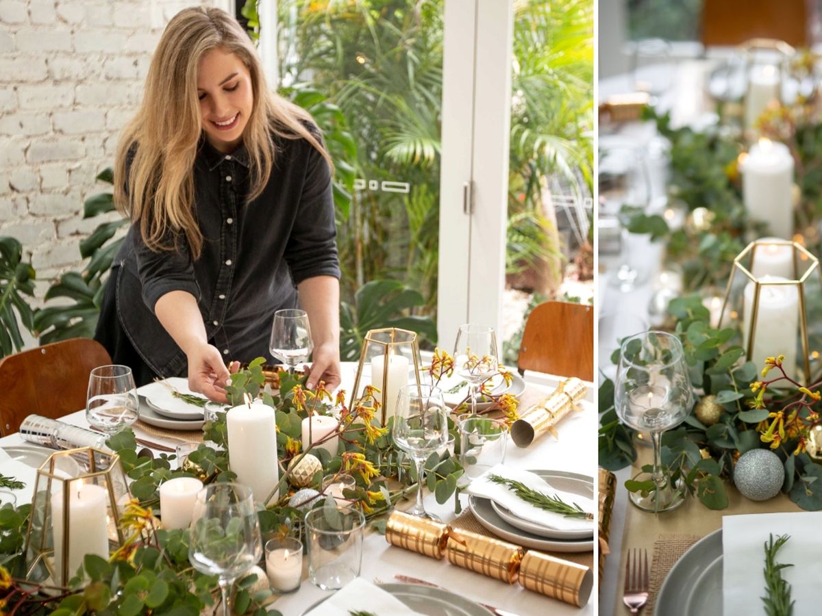 Create an elegant christmas table setting on a budget. Decorate using objects of different heights. Glimmer and green place setting To recreate this tablescape, begin with a white linen tablecloth. Simply place small vases throughout the garland and trim an amaryllis stem to fit snuggly over the rim of the vase.